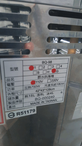 外殼採用430不繡鋼製成 附漏水自動斷水偵測(選配) 全機採用微電腦控制-穩定準確 內缸採用304不繡鋼製成-耐用堅固 取水照明LED燈-省電方便夜間使用 全機附漏電斷路器及保險司-安全有保障 採用台灣大廠大同牌壓縮機-品質穩定耐用 冷煤採用R -134a環保冷媒-愛護環境人人有責 溫水冰水皆經煮沸後冷卻,飲用更安全衛生 水溫:冰、溫、熱 尺寸:寬42*深43*高127(CM) 材質:外殼採用不繡鋼材複合而成 電壓:AC-110V 60Hz (220V需訂製) 容量:冰4公升、溫10公升、熱15公升 功率:加熱750W、冷凍210W 功能:防燙龍頭、防漏偵測、溫度顯示 過濾:選配 五道式純水機/生飲式過濾器
